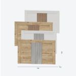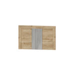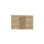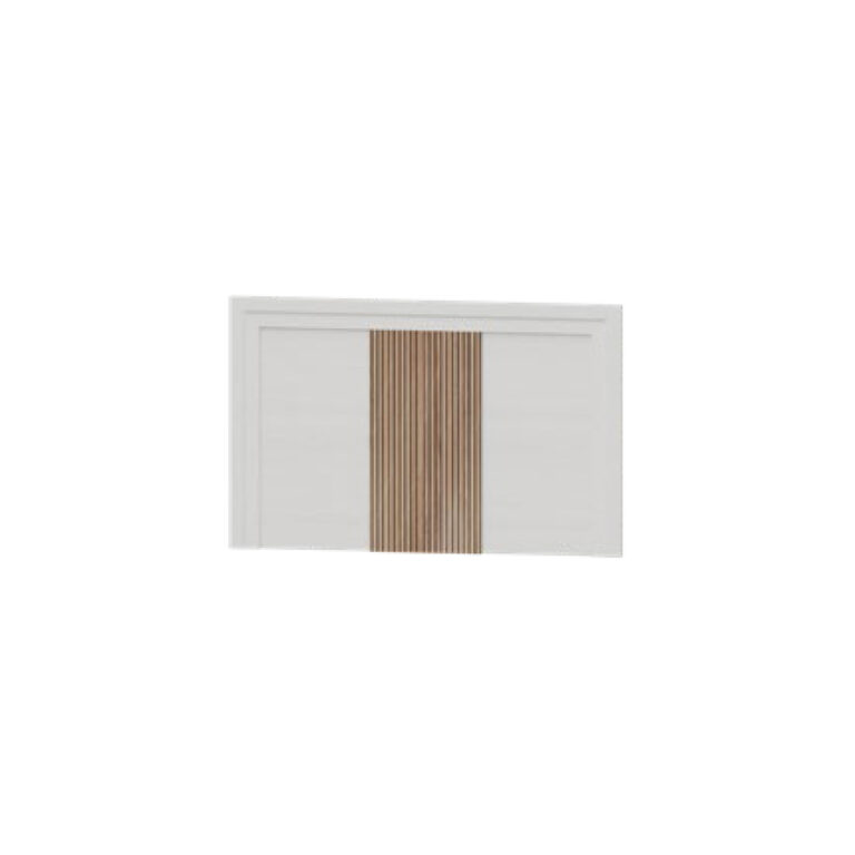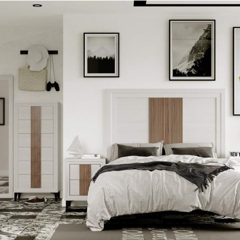 Disponible en acabados Blanco o Roble, cada versión combina tonos contrastados en su panel central: en el acabado Blanco, el alistonado puede ser Ártico o Roble; y en el acabado Roble, el detalle central puede presentarse en Ártico o Roble, ofreciendo distintas combinaciones según el estilo del dormitorio.
