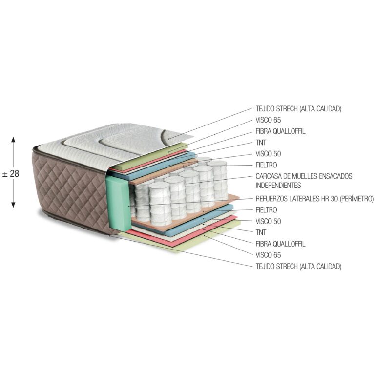 Carcasa de muelles ensacados independientes protegida con bañera de HR 30D en el contorno perimetral de alta resiliencia (sin varilla). Su amortiguación es de fibra textil punzonada sobre rafia y termofusionada. En el acolchado Tapa a Tapa lleva viscoelástica + vissoft + fibra qualloffil en ambas caras iguales. Altura del colchón 28 cm +/-. Fabricado en Andalucía (es todo un lujo).