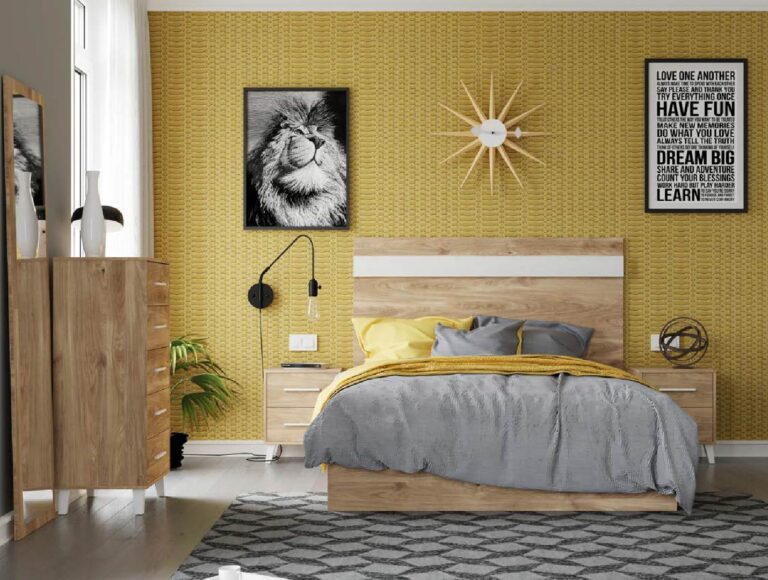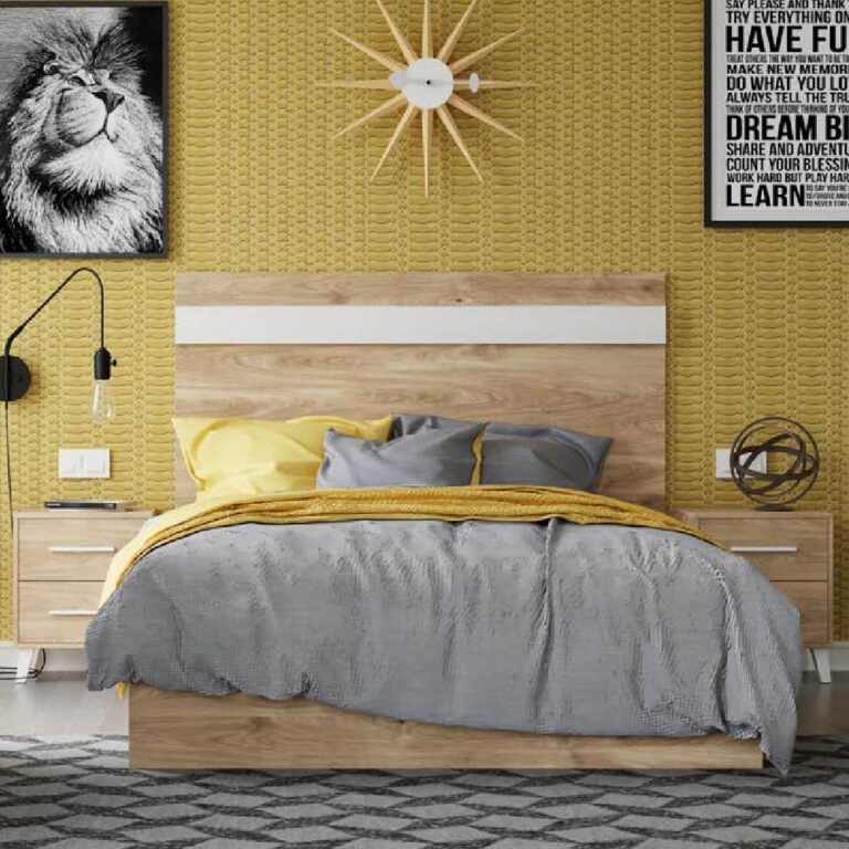 Domitorio Puzzle 11 en roble con patas de 12 cm de altura y tiradores en blanco. Incluye cabecero puzzle 4, dos mesitas de noche y un sinfonier con espejo.