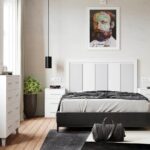 Dormitorio Puzzle 13 en blanco, con patas plata de 12 cm de altura y tiradores plata. Incluye dos mesitas de noche, una cómoda y un espejo.