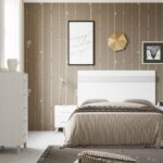 Domitorio Puzzle 14 en blanco, con patas de 12 cm de altura y tiradores en plata. Incluye cabecero Puzzle 4, dos mesitas de noche con patas y un sinfonier con patas y espejo.